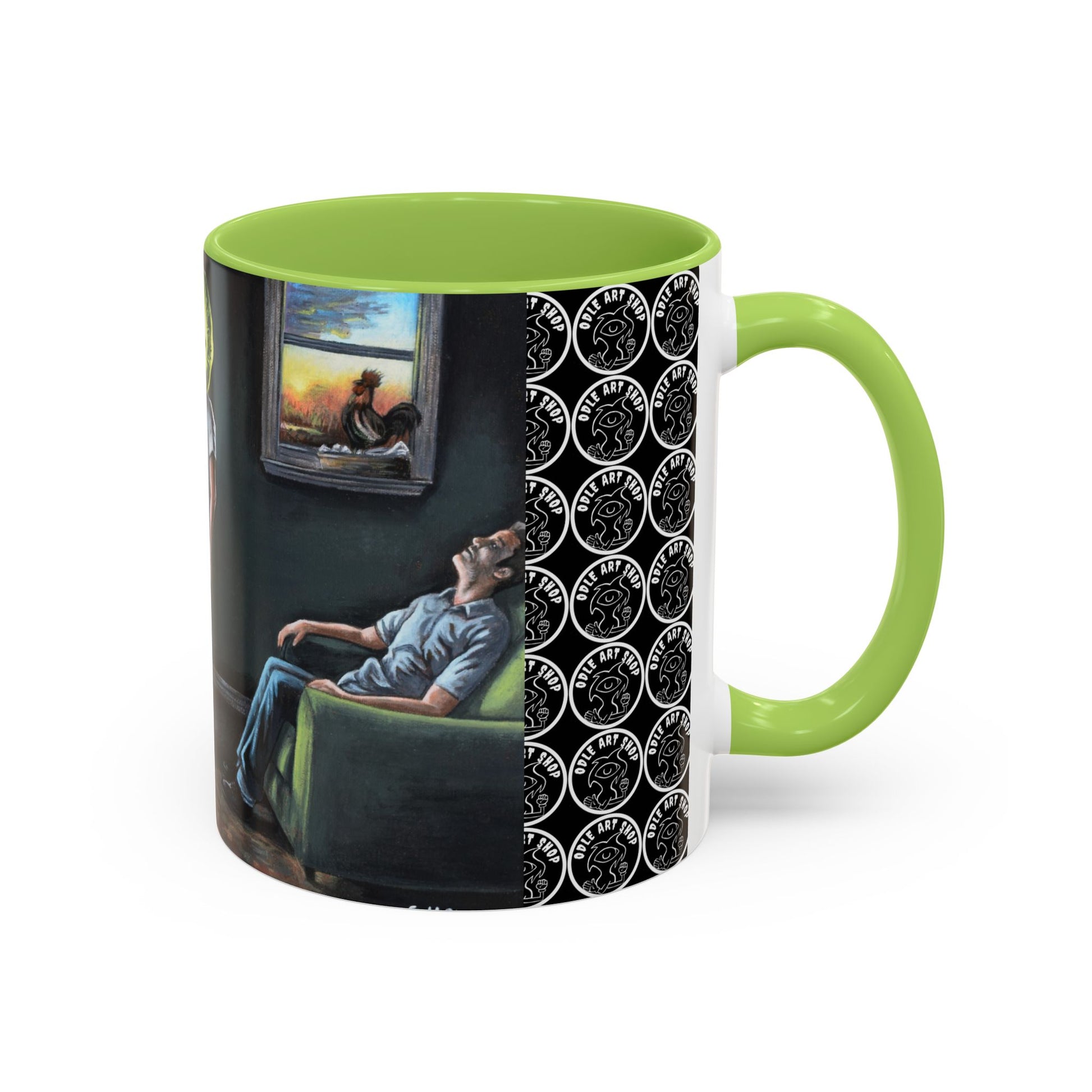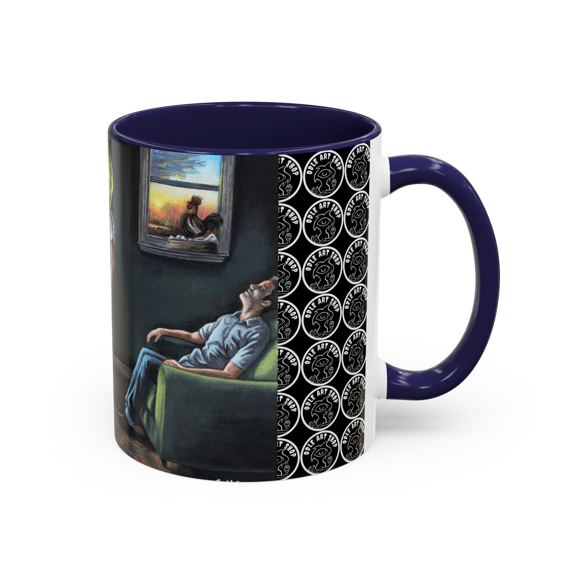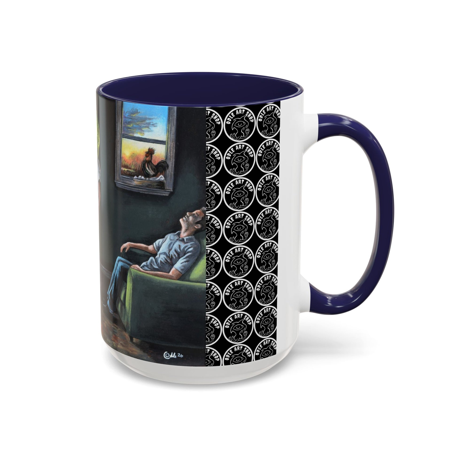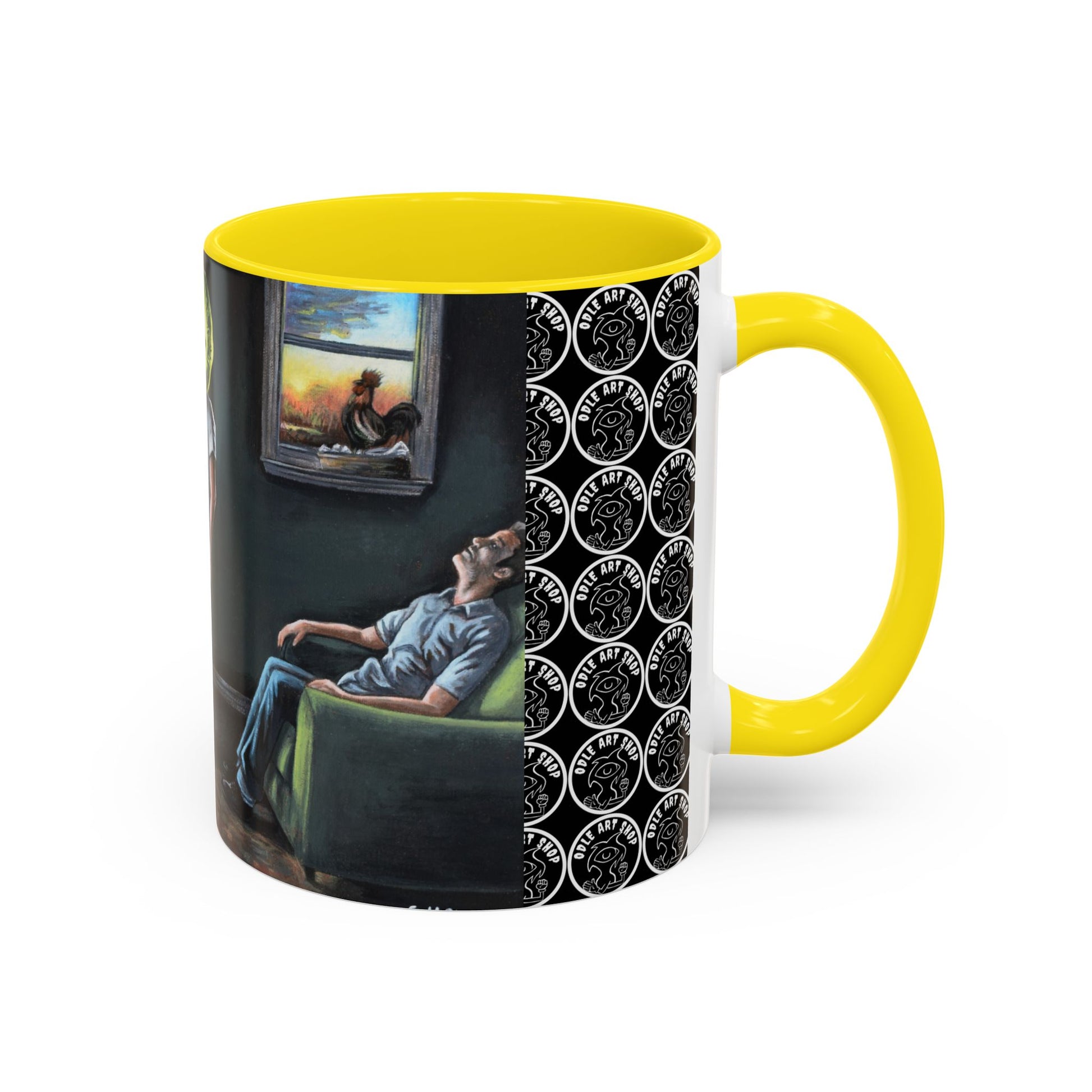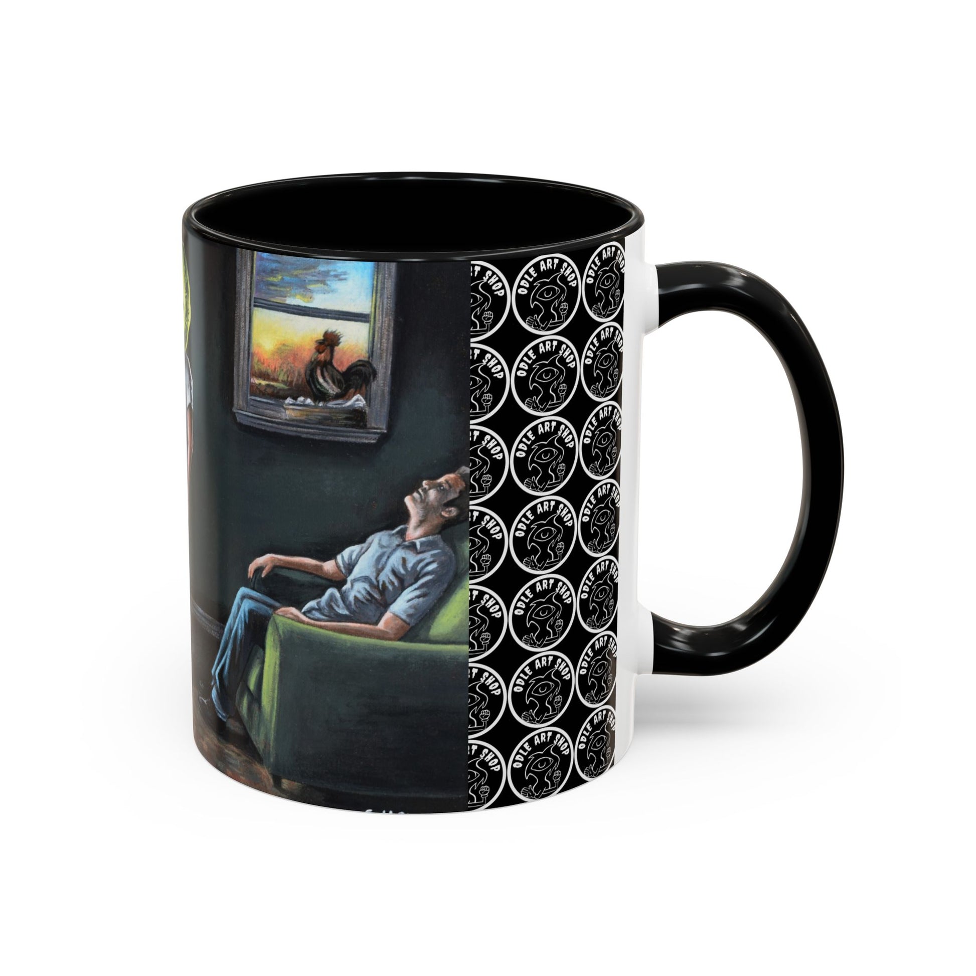 Hold a little uneasy joy in your hands. This ceramic accent mug pairs glossy black detailing with a surreal painted scene: a person wearing a smiley-face mask in a dim room, another figure slumped in a chair, and framed landscapes glowing on the walls. It feels like a quiet, late-night conversation at the edge of a dream — ironic, thoughtful, and a touch dark. Sip slowly and let the contrasts — bright interior color against deep exterior art — pull you into a story each morning or whenever you need a moment of strange comfort.