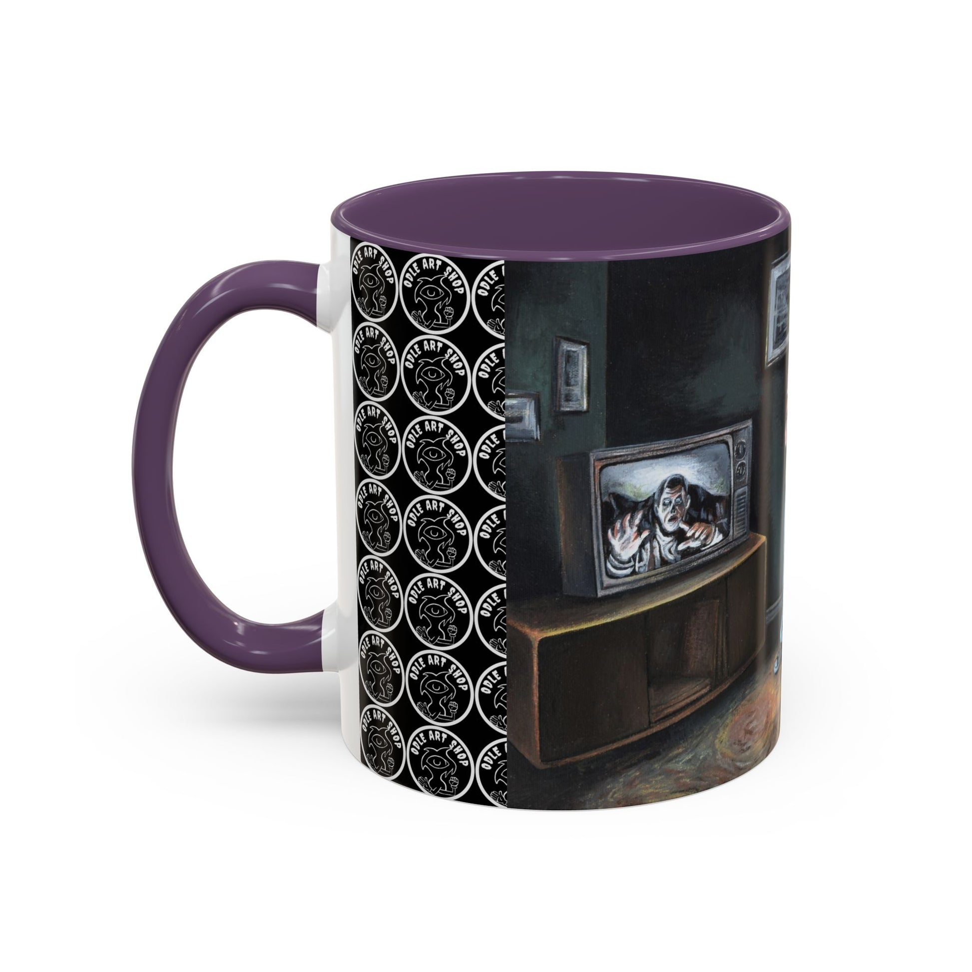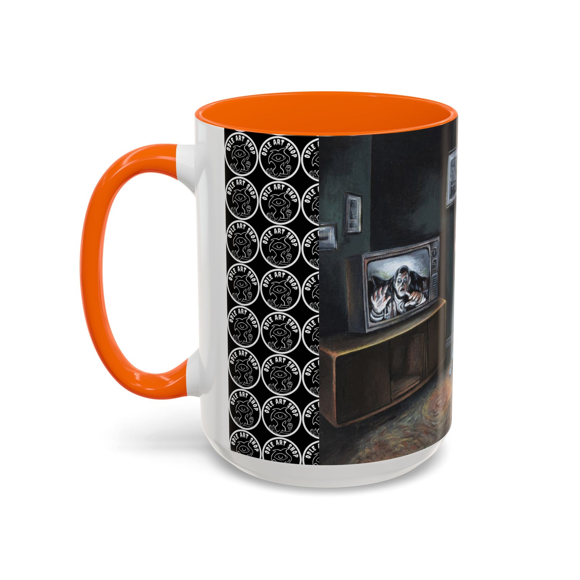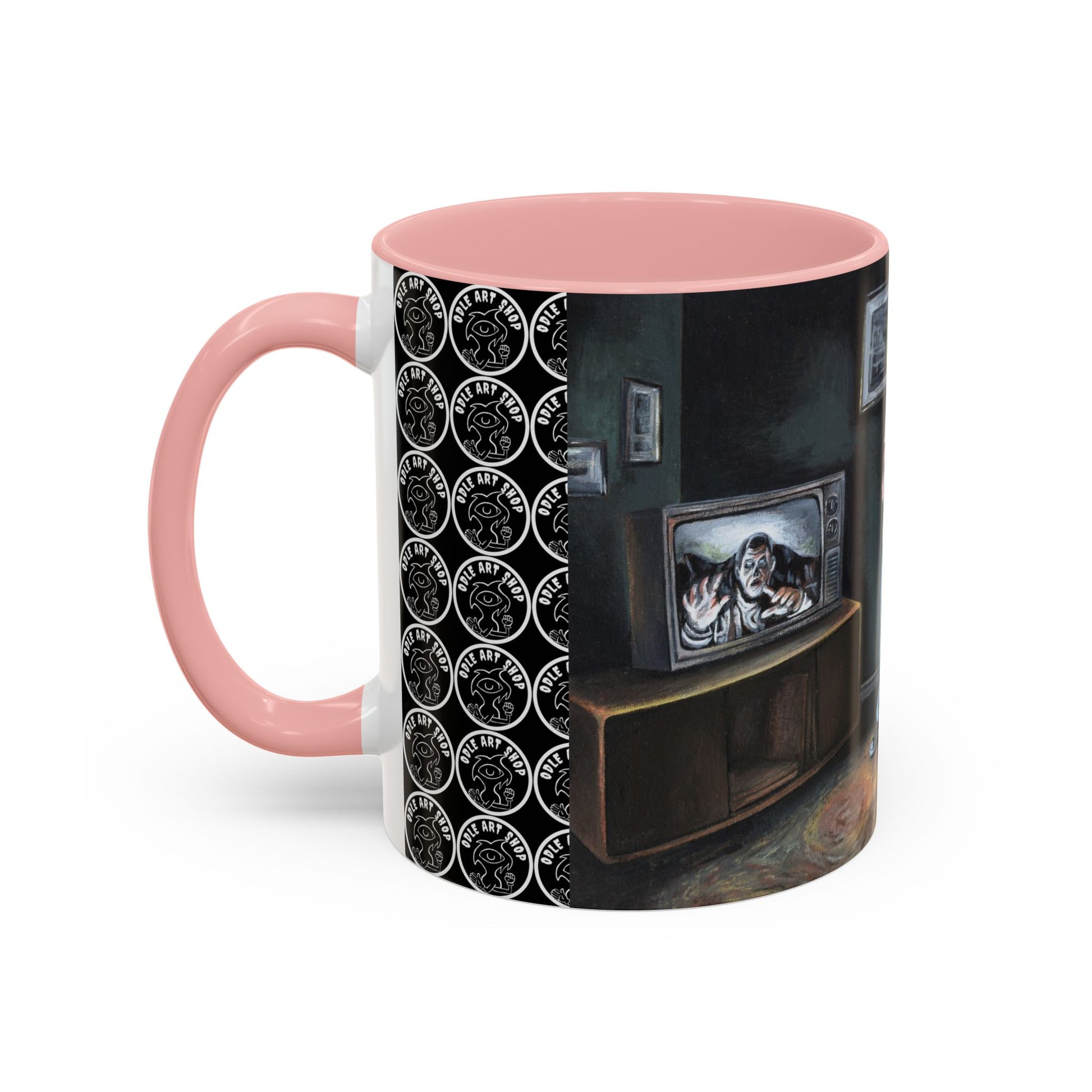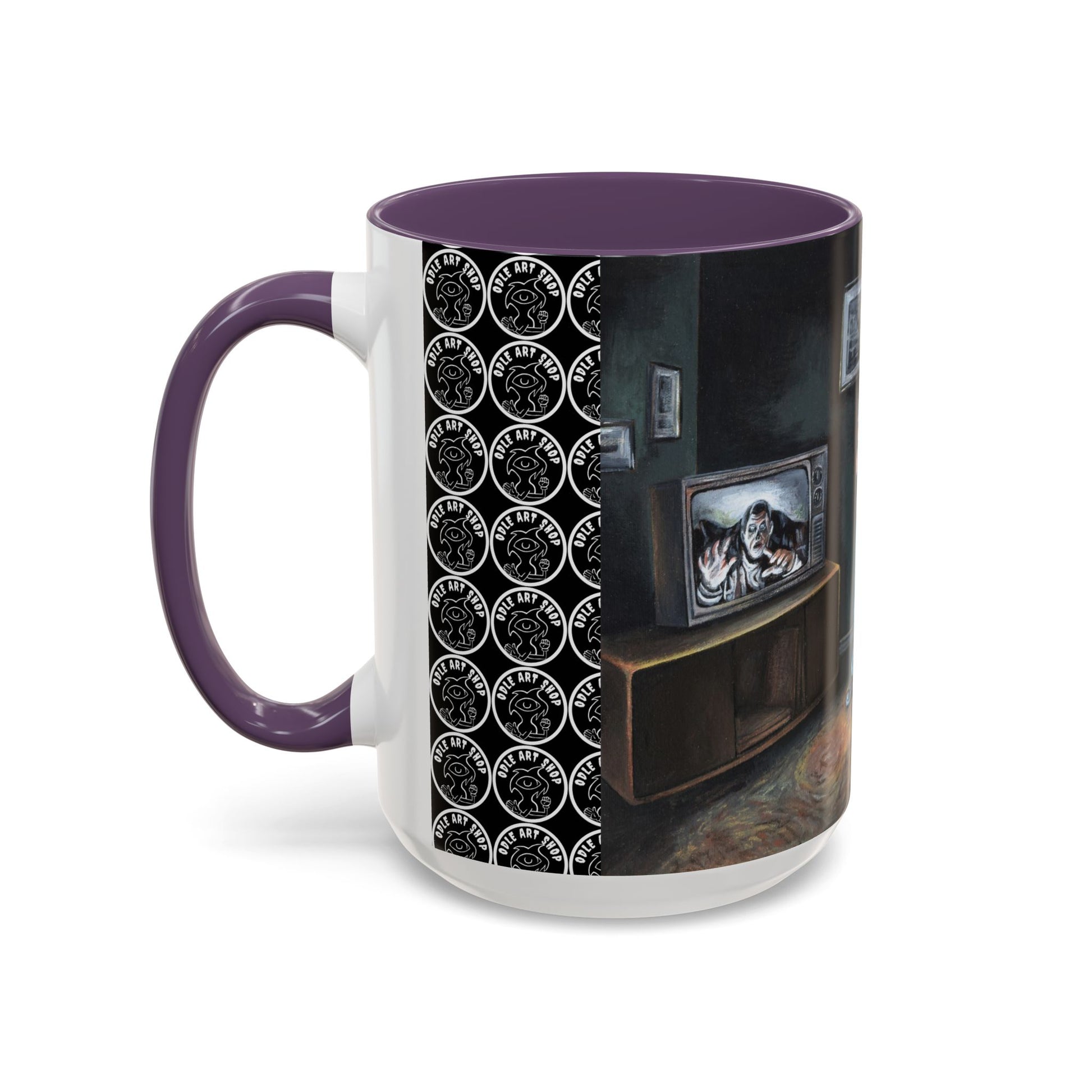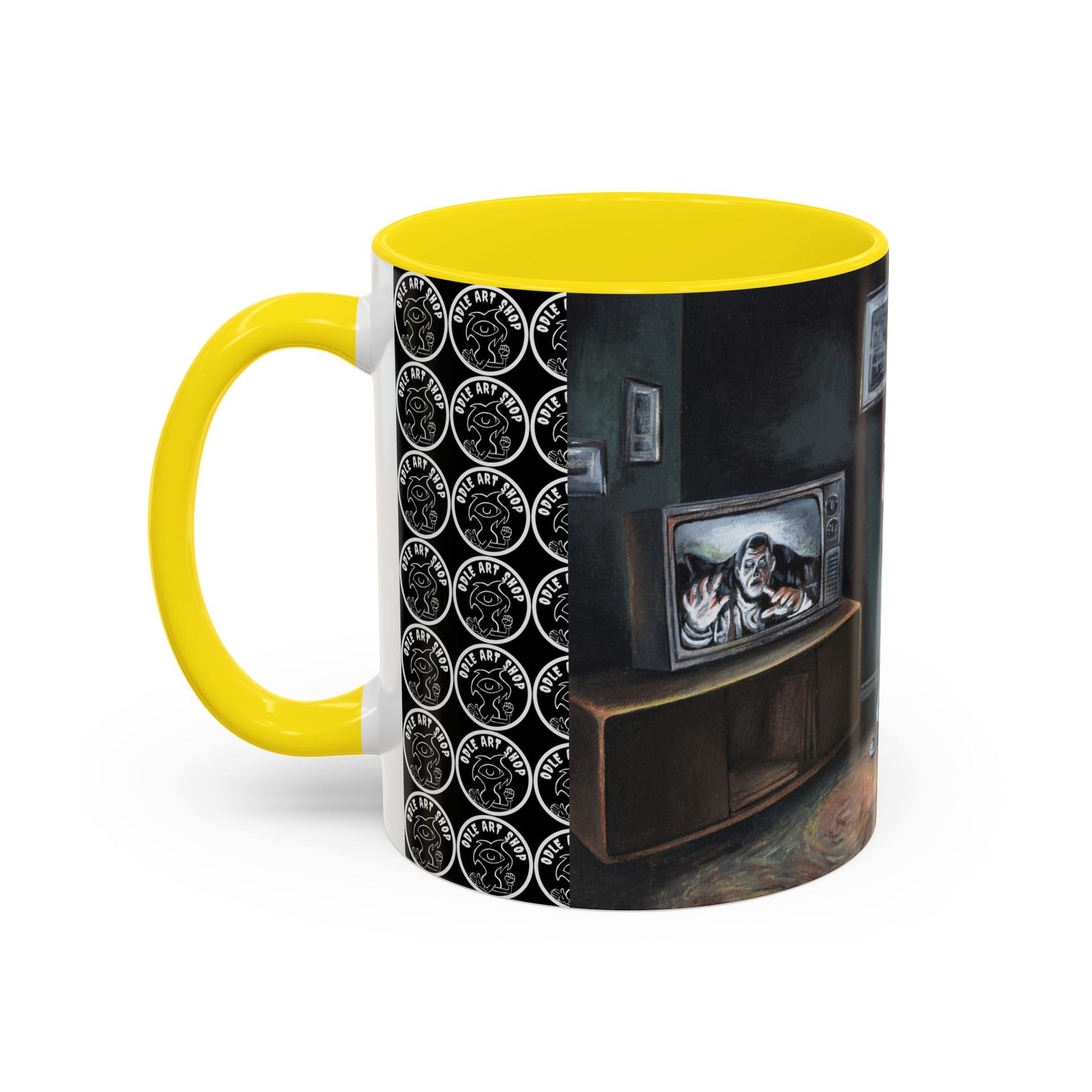 Hold a little uneasy joy in your hands. This ceramic accent mug pairs glossy black detailing with a surreal painted scene: a person wearing a smiley-face mask in a dim room, another figure slumped in a chair, and framed landscapes glowing on the walls. It feels like a quiet, late-night conversation at the edge of a dream — ironic, thoughtful, and a touch dark. Sip slowly and let the contrasts — bright interior color against deep exterior art — pull you into a story each morning or whenever you need a moment of strange comfort.