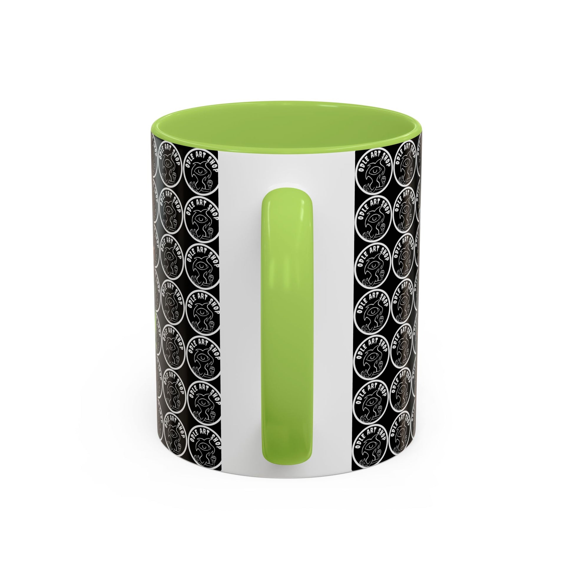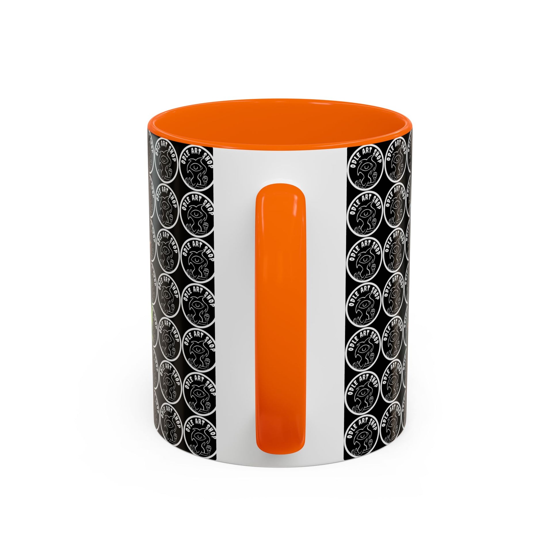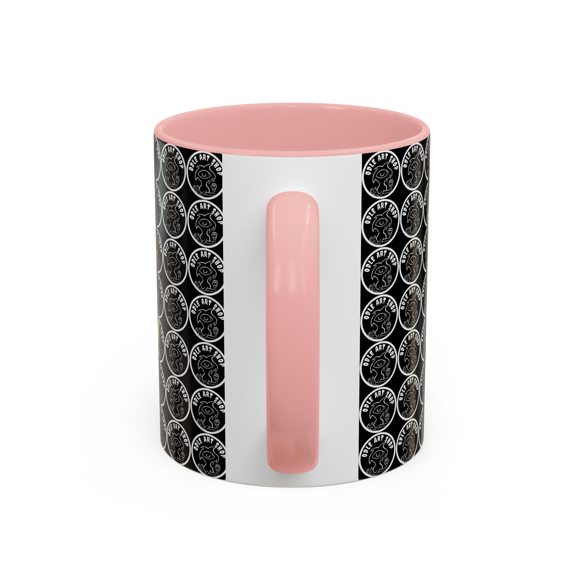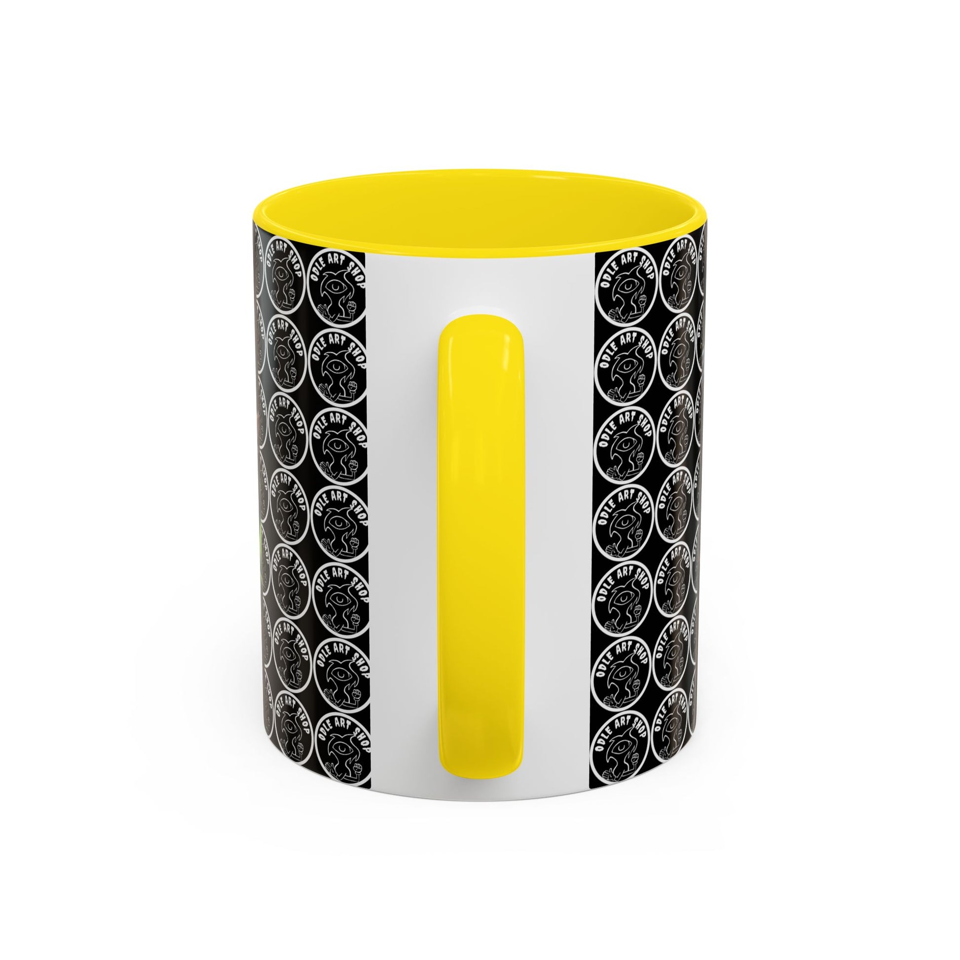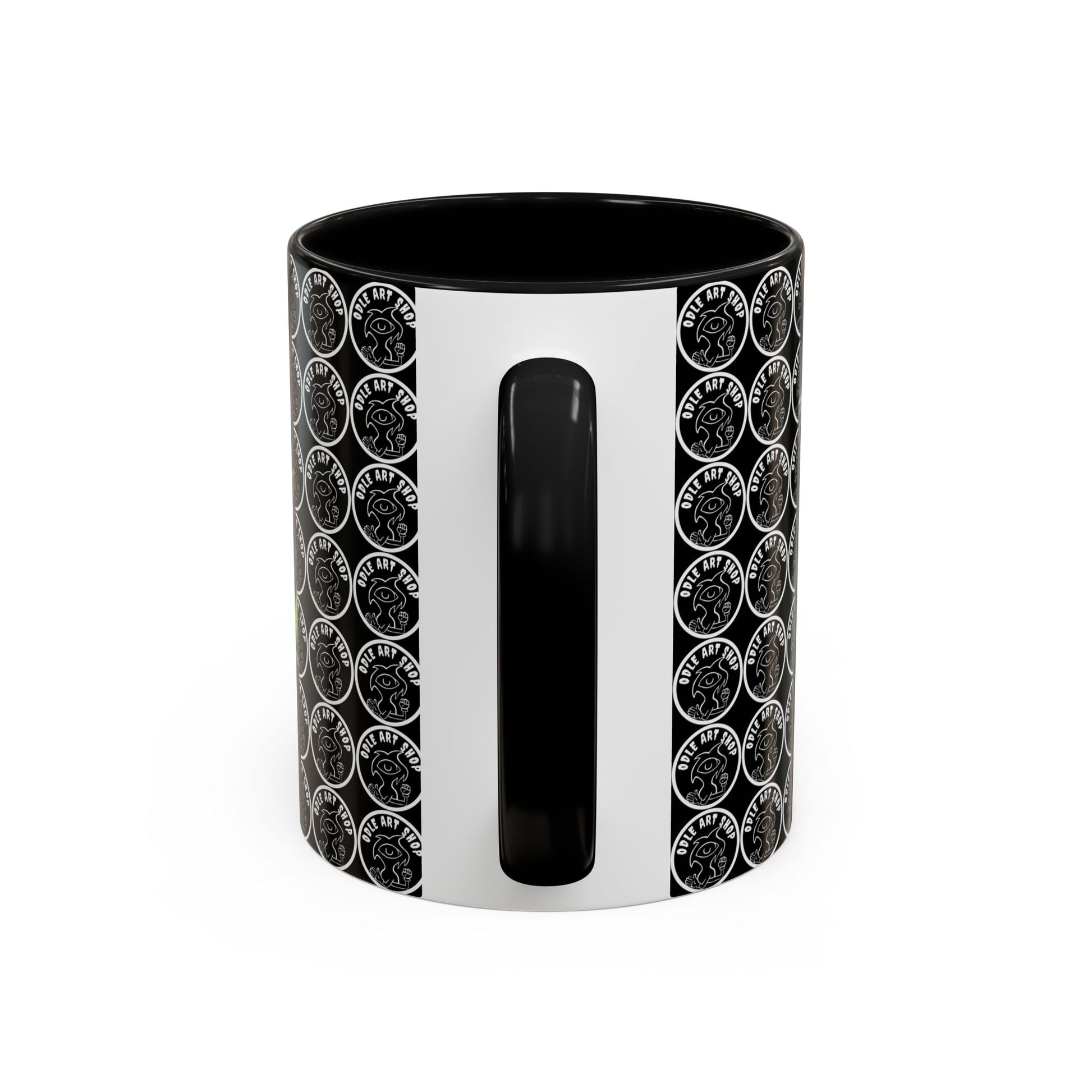 Hold a little uneasy joy in your hands. This ceramic accent mug pairs glossy black detailing with a surreal painted scene: a person wearing a smiley-face mask in a dim room, another figure slumped in a chair, and framed landscapes glowing on the walls. It feels like a quiet, late-night conversation at the edge of a dream — ironic, thoughtful, and a touch dark. Sip slowly and let the contrasts — bright interior color against deep exterior art — pull you into a story each morning or whenever you need a moment of strange comfort.