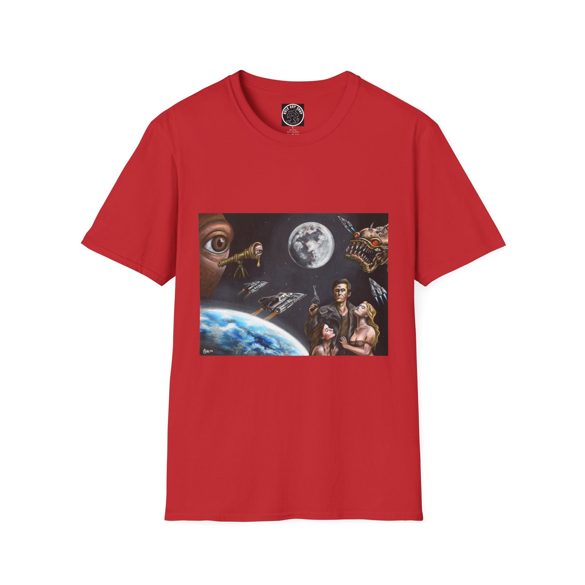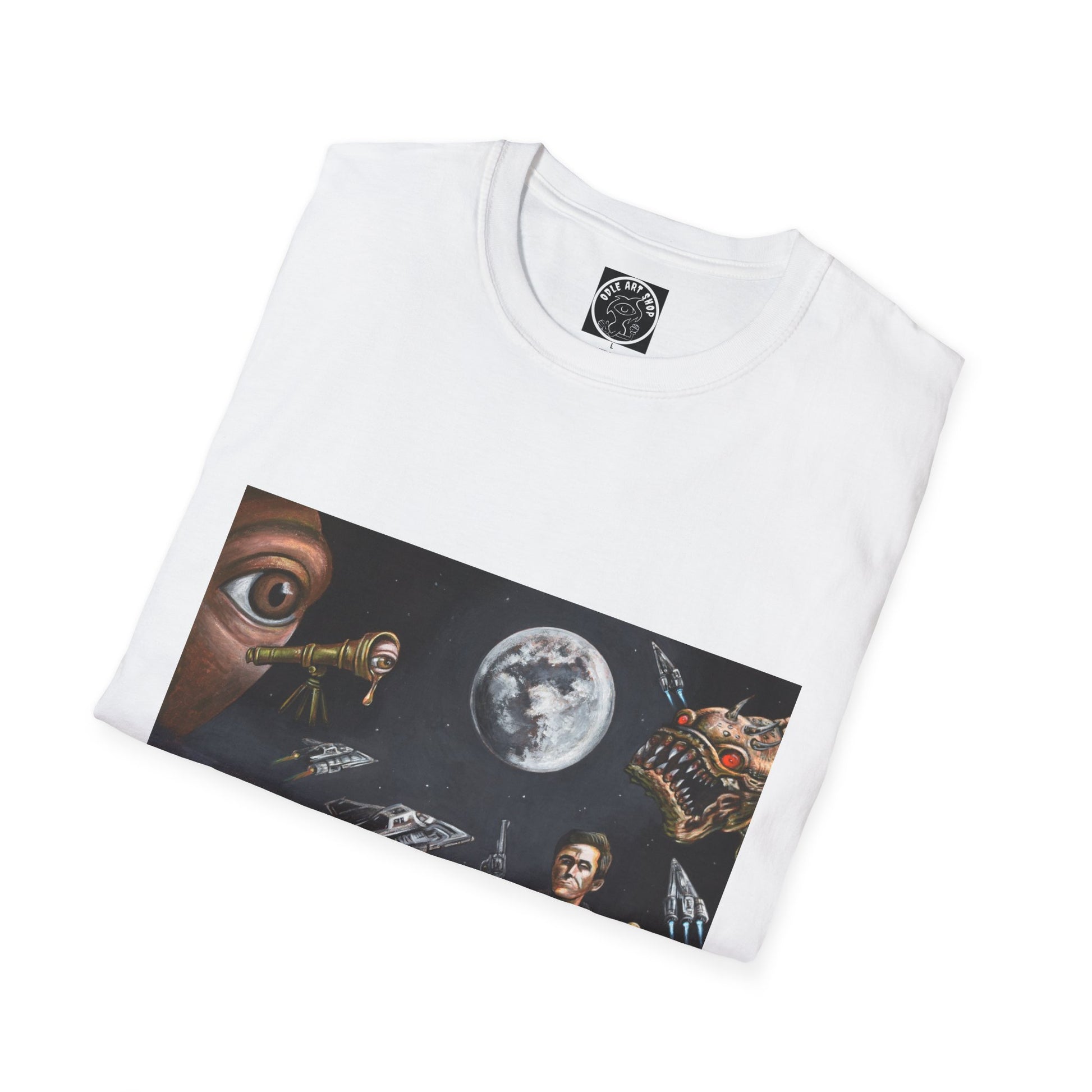 A lightweight, soft cotton tee printed with a striking retro sci‑fi scene — astronauts, starships, a full moon and planetary horizon with cinematic, painterly detail. The image sits centered on a clean white canvas, giving the artwork room to breathe while the shirt’s classic crew neckline and relaxed fit keep the look wearable every day. This shirt feels like stepping into a late‑night movie marathon: nostalgic, a little mysterious, and ready for conversation. Wear it to fan meetups, record-store runs, or when you want a quiet reminder that there are bigger stories out there.