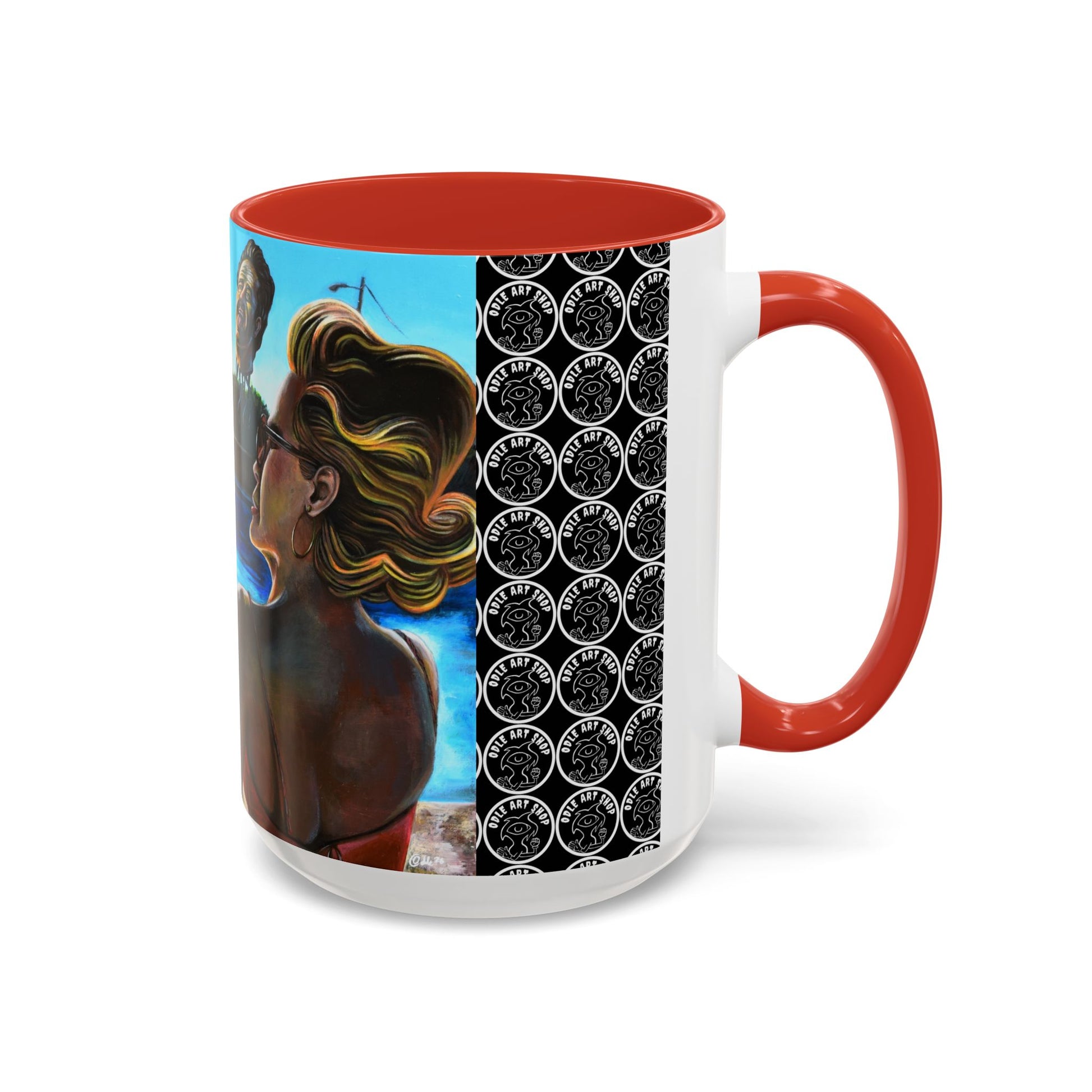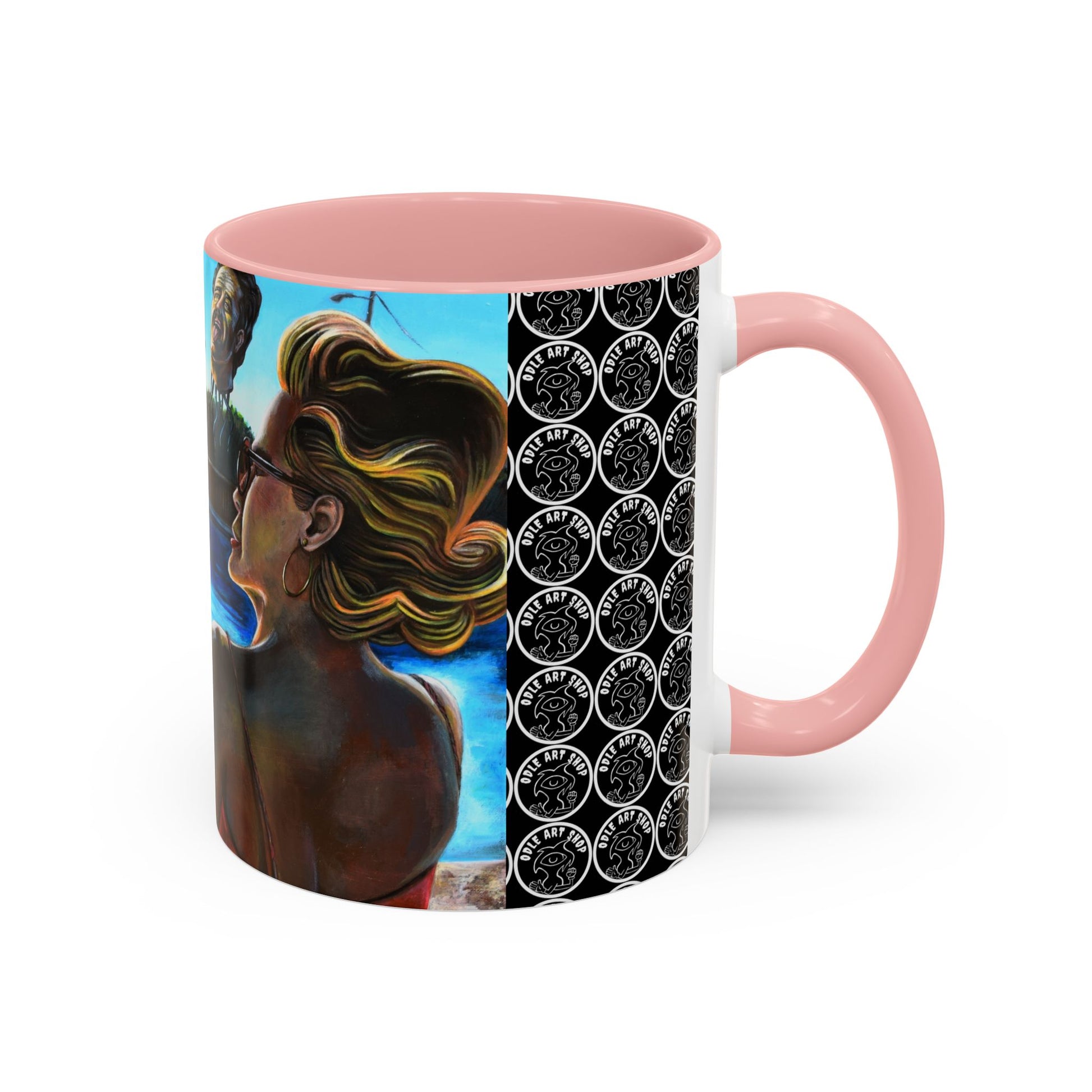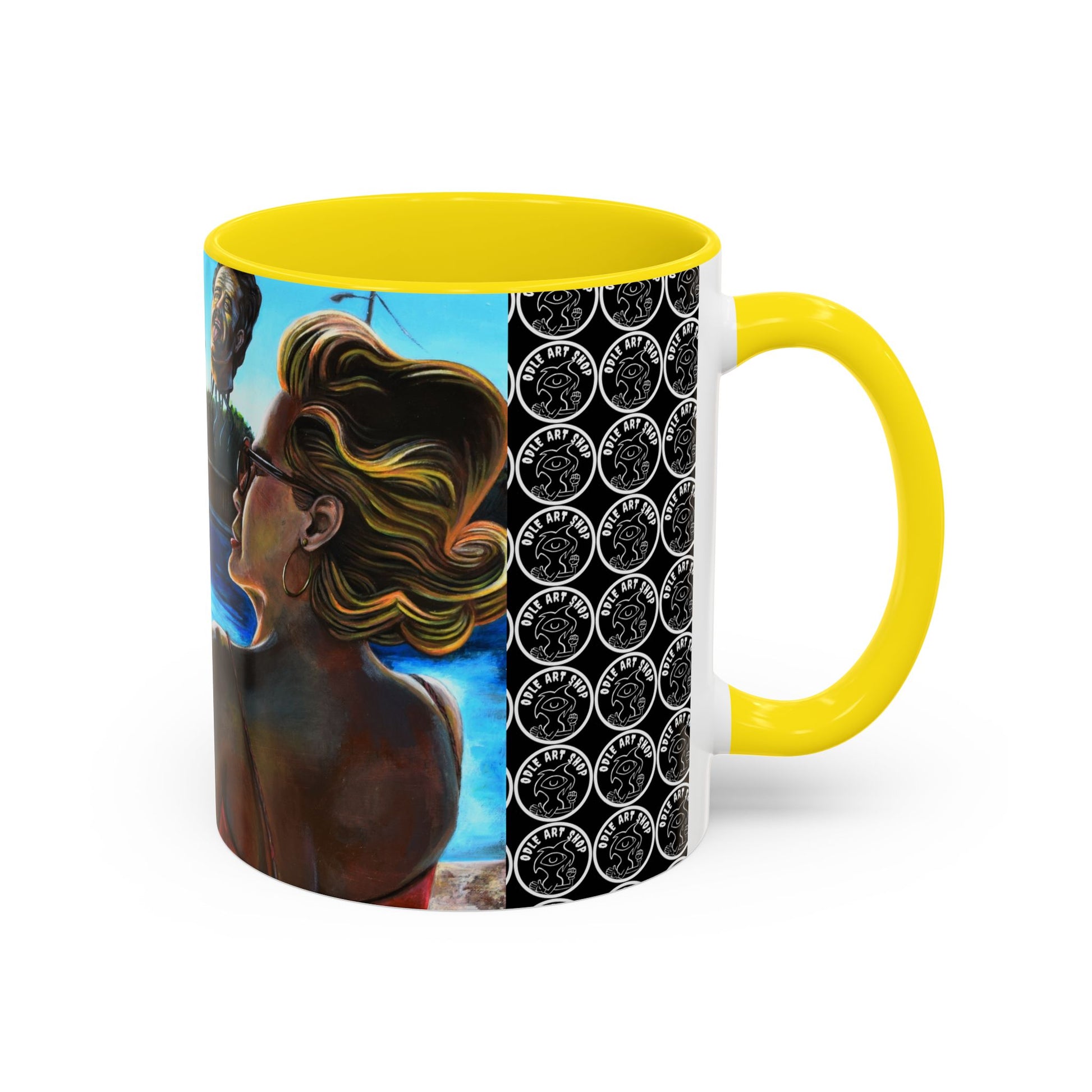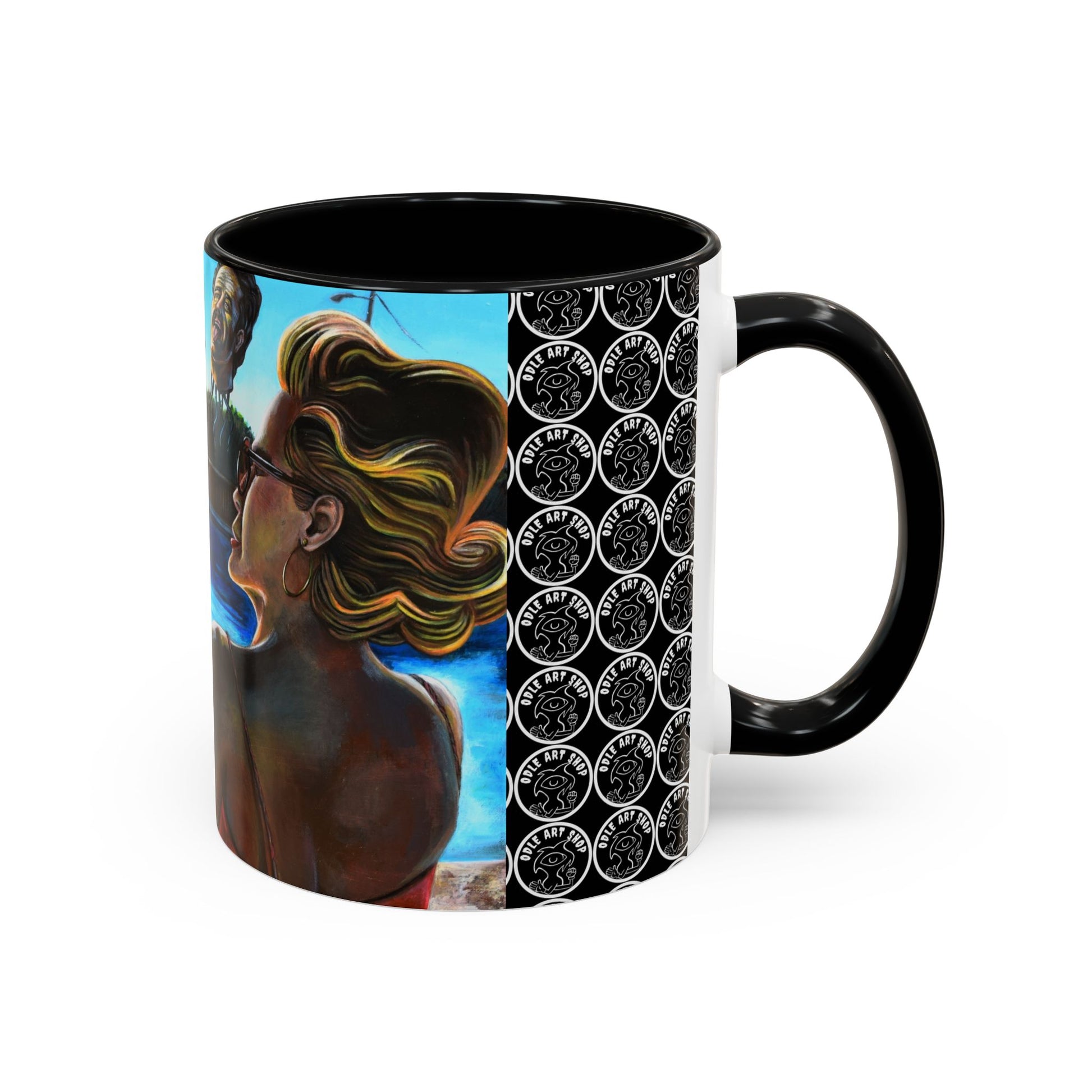 A vibrant ceramic mug that brings surreal beachside daydreams into your daily ritual. The glossy black-accented interior and handle frame a colorful wraparound illustration: sunlit water, reclining figures with whimsical, dreamlike heads, and a repeated patterned panel that adds visual rhythm. Each sip feels like a pause at the edge of a strange, joyful summer — a quiet, curious moment between friends and imagination. This mug fits into a slower morning where art and coffee meet; it’s for people who collect oddities, tell stories over cups, and love objects that spark conversation.