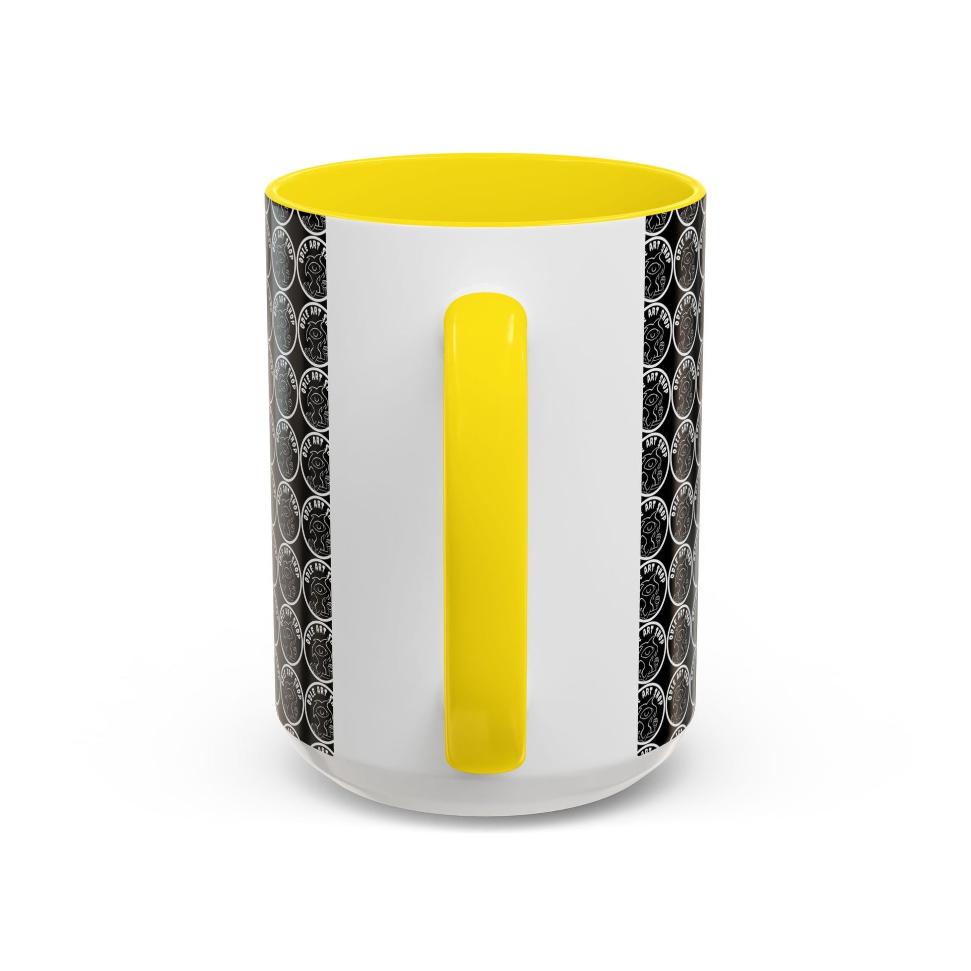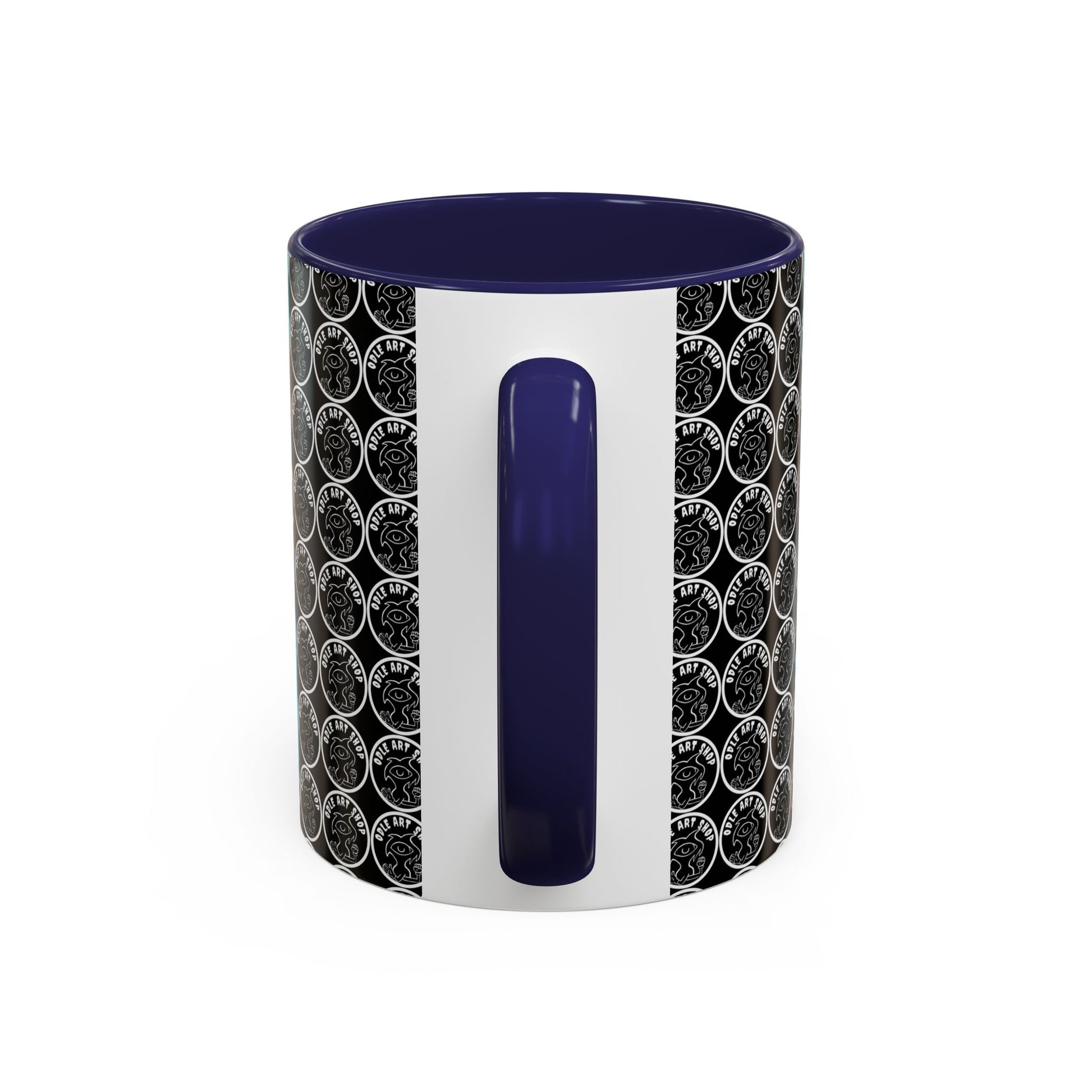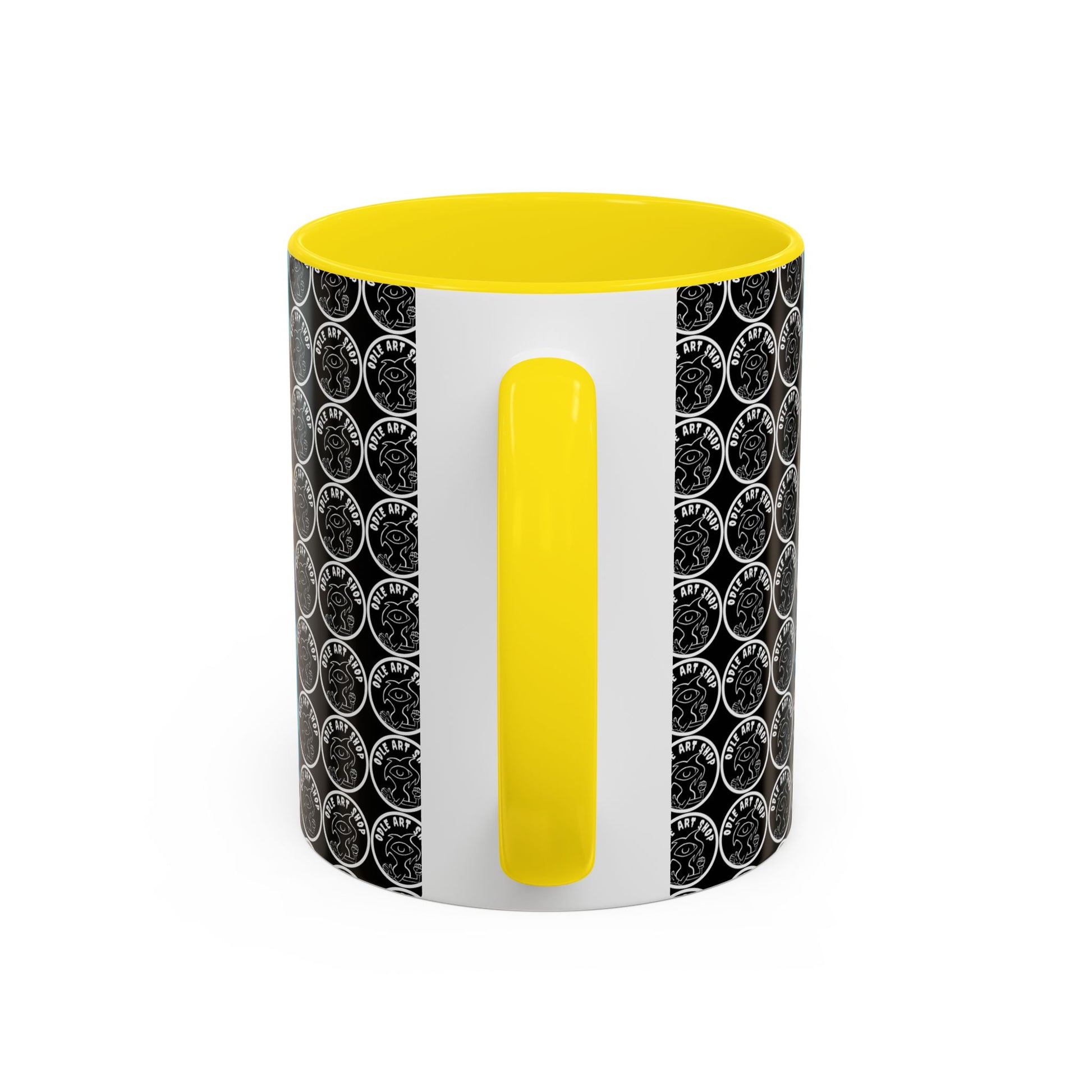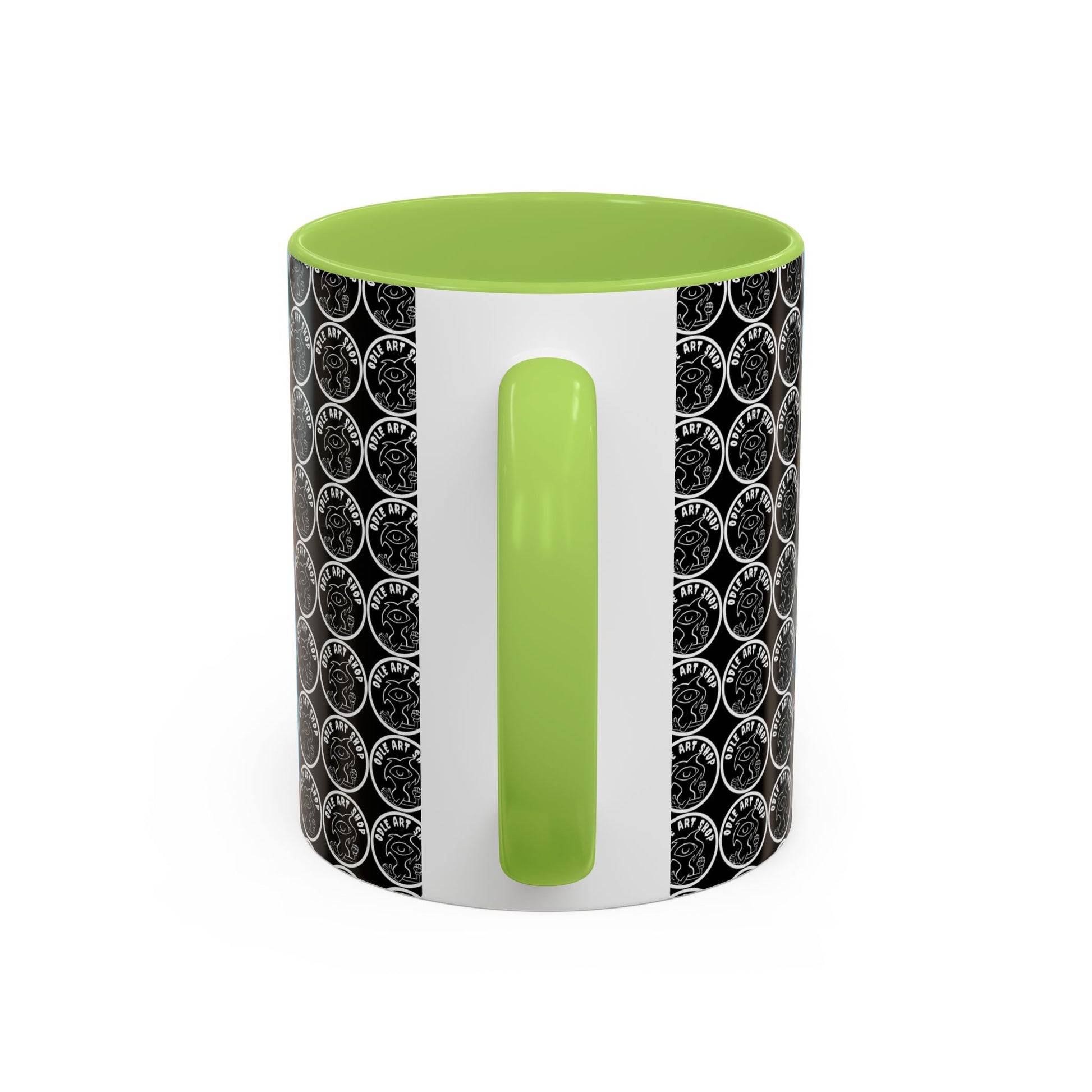 - White ceramic body with colored interior and C-shaped handle for comfortable grip