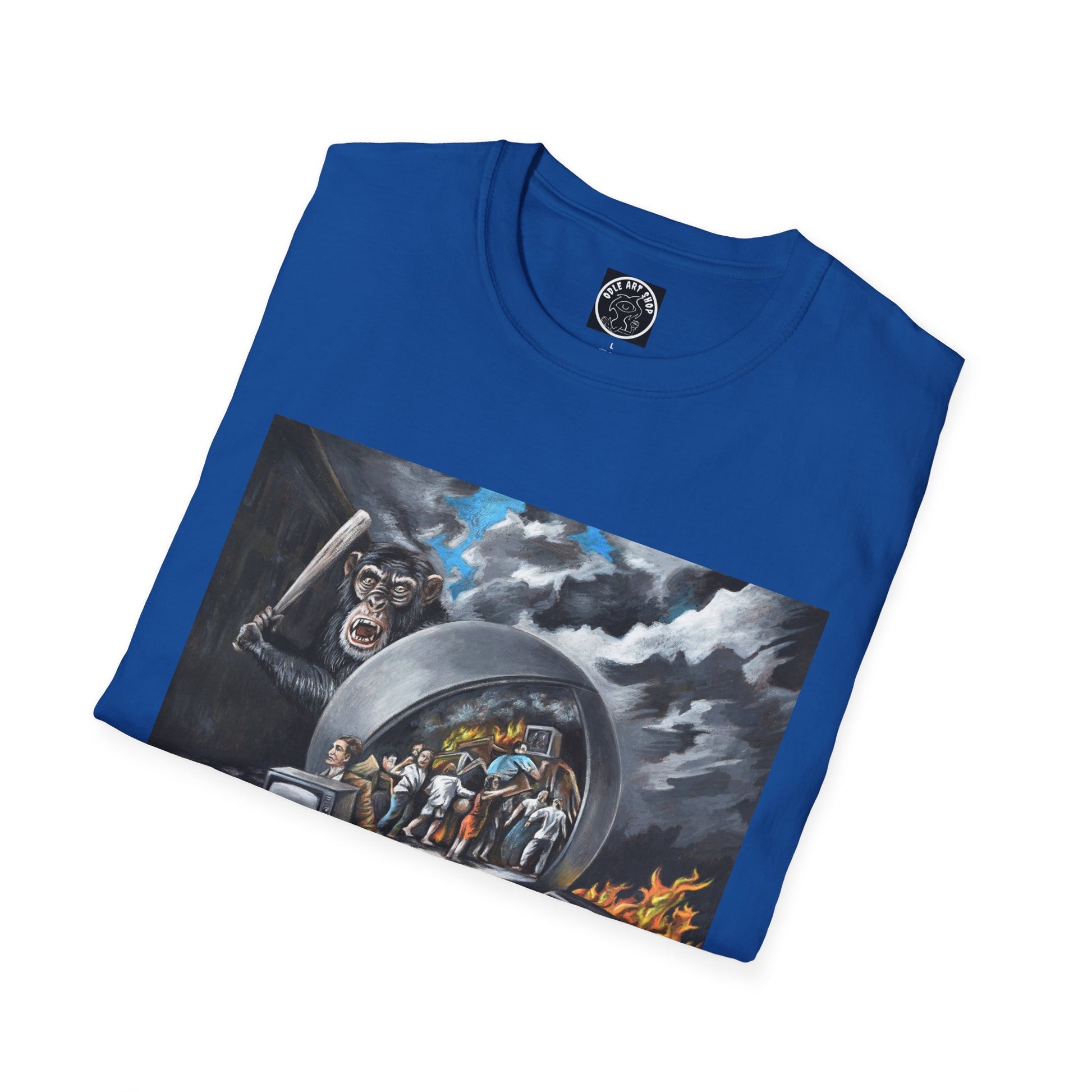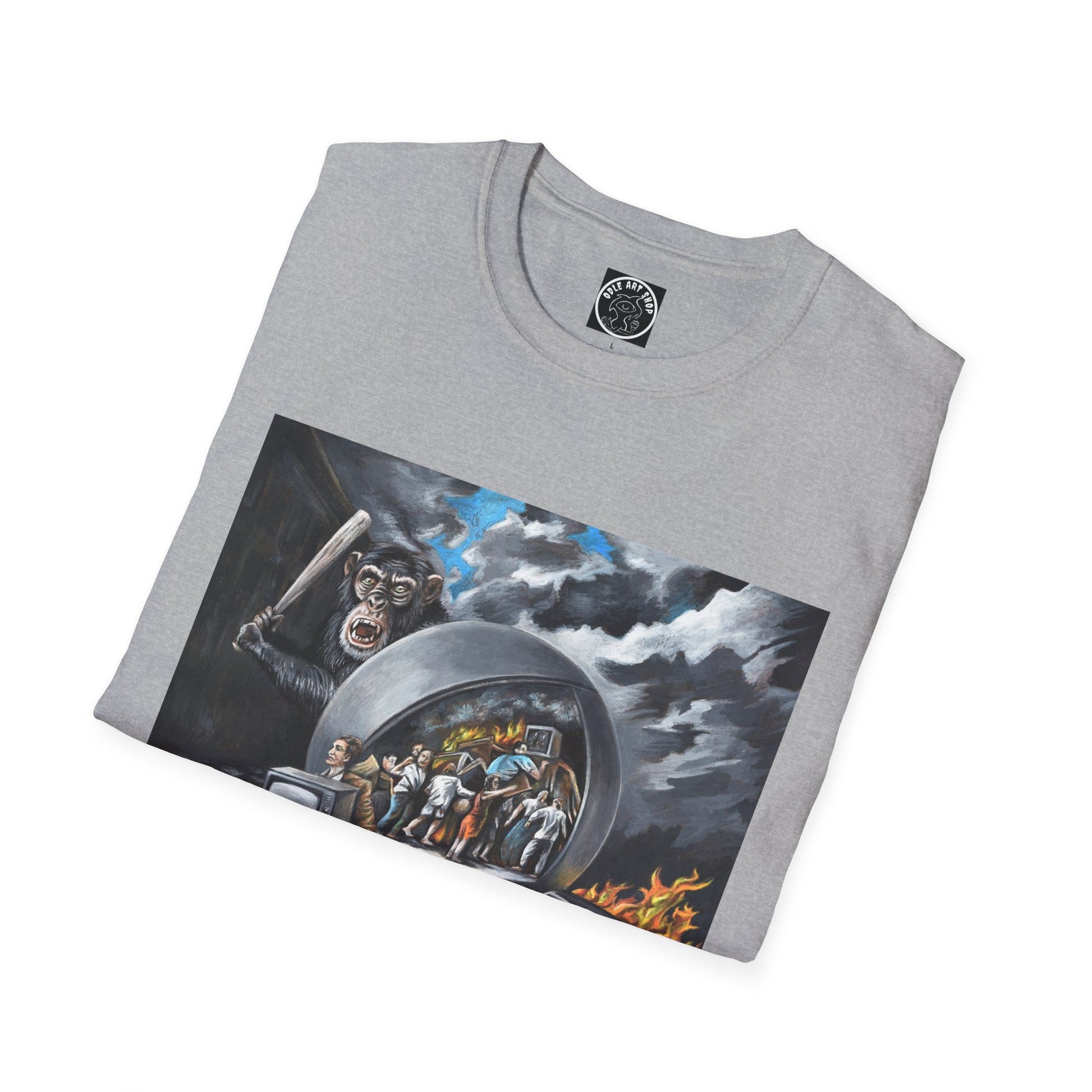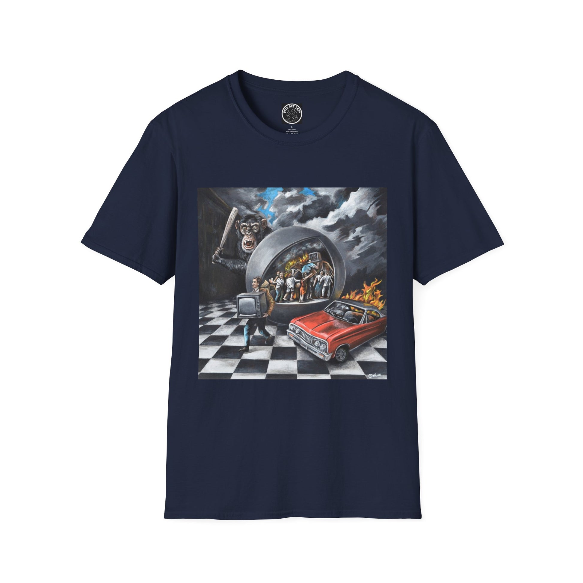This lightweight cotton tee wears like a well-loved favorite from the first pull-on. The printed scene centers on a cinematic, surreal tableau: a vintage red car sits on a checkered floor beneath a stormy, cloud-swirled sky, while a curved, mirror-like portal frames a gathering of figures and a distant fire. The artwork reads like a quiet narrative—moody, slightly uncanny, and full of detail—making the shirt a wearable conversation piece for evenings out, gallery visits, or just wandering the city with friends. The crew neck and classic cut keep the silhouette clean so the artwork takes center stage. Comfortable year-round, it layers easily under jackets or stands on its own when you want your outfit to tell a story.