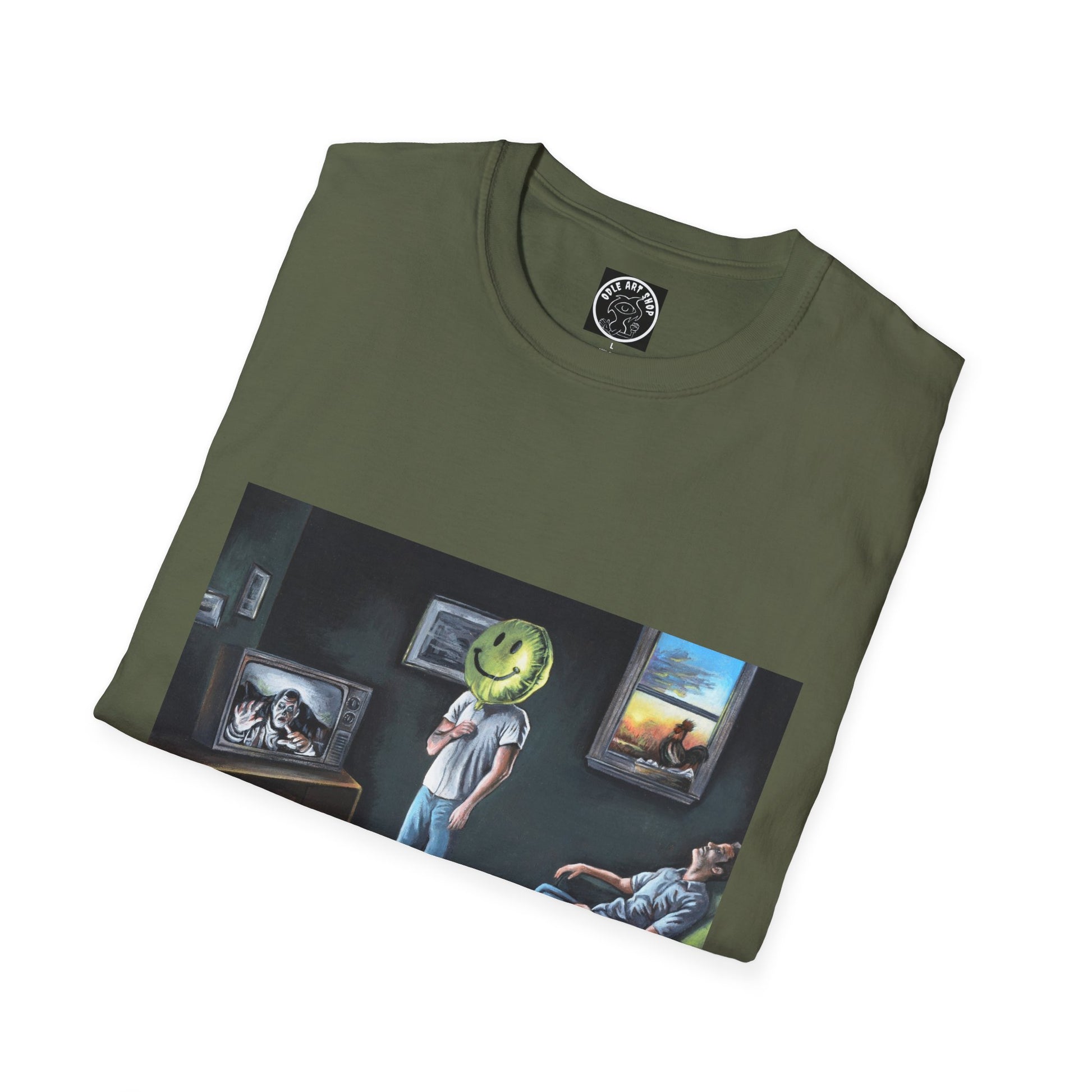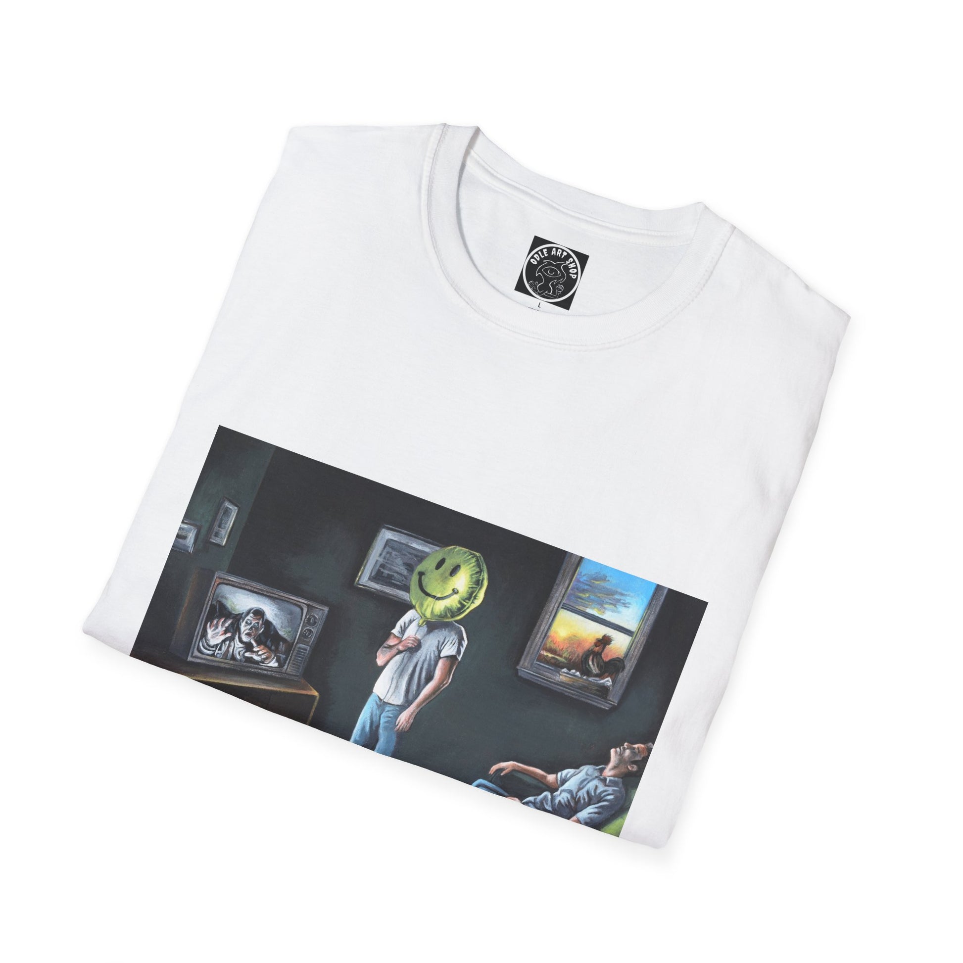 Surreal Smiley Mask Art T-Shirt — Retro TV Night Scene